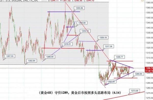 持續了一周之久的1303-1290的箱體震蕩經歷了隔夜美聯儲加息依然未能走出區間,且短周期2條藍色的趨勢線形成的收斂三角形處于末端震蕩狀態,破位似乎呼之欲出,而日線級別均線粘合,周線企穩5周線后,結合美元走勢筆者較為看好向上的破位上行格局,而技術面目前多頭的關鍵防守在1289位置,守住1289,向上破位1308,多頭將打開空間!