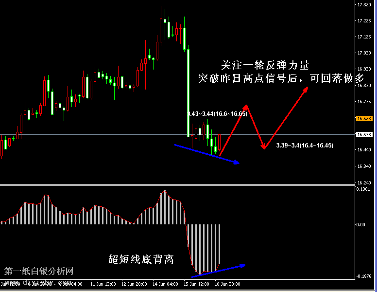 今日下方關鍵支撐3.38(16.35)、3.33~3.35(16.1~16.2)、3.31(16);今日上方關鍵阻3.52~3.55(17.05~17.2)、3.58(17.35)。 提示:技術僅僅是基于概率論和統計學的一種綜合分析手段,絕非預測。所以技術分析是在考慮做好止損的情況下去博取大概率事件,投資不可過于迷信技術分析。(短線操作請一定做好止損,一旦被損,代表分析師基于概率和統計的技術分析不適用于當前行情) 另外,由于紙白銀價格是國際銀價換算而來,而換算過程中涉及到人民幣對美元匯率的變化,即使在國際銀價不變化的情況下,如果人民幣貶值或升值,也會導致紙白銀價格出現變動。因此,我們的分析只采用最新的國際銀價對應的人民幣白銀價格,如與過去分析價格有出入, 投資者應知曉其原因。 1、文中價格為紙白銀價格,括號內為國際銀價,投資者可雙向參考。 2、以上所有價格為工商銀行買入價,即紙白銀低價。進倉點位要再加點差(各銀行點差不一),出倉則不要。 3、第一紙白銀給出的所有建議僅供投資者參考,不作為下單絕對依據,切勿過于依賴。 4、北京時間09:00發布此文章。 5、上一交易日白銀價格分析情況:(6月18日)白銀仍維持進三退二 回踩趨勢線關注反彈