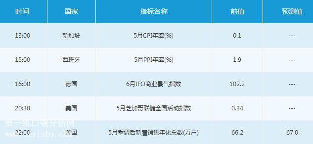 美盤時(shí)段,關(guān)注20:30公布的美國(guó)5月芝加哥聯(lián)儲(chǔ)全國(guó)活動(dòng)指數(shù),22:00公布的美國(guó)5月季調(diào)后新屋銷售年化總數(shù)。