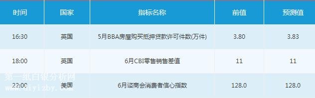 周二(6月26日)亞歐時段,投資者需關注16:30公布的英國5月BBA房屋購買抵押貸款許可件數,18:00公布的英國6月CBI零售銷售差值。
