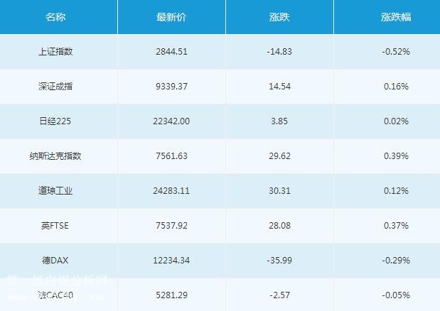 道瓊斯指數周二收盤上漲30.31點,漲幅0.12%,報24283.11點;標普500指數周二收盤上漲5.99點,漲幅0.22%,報2723.06點;納斯達克指數周二收盤上漲29.62點,漲幅0.39%,報7561.63點。