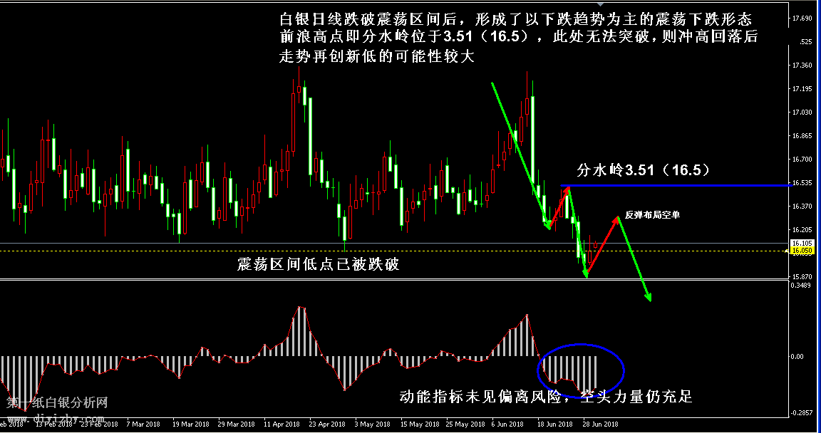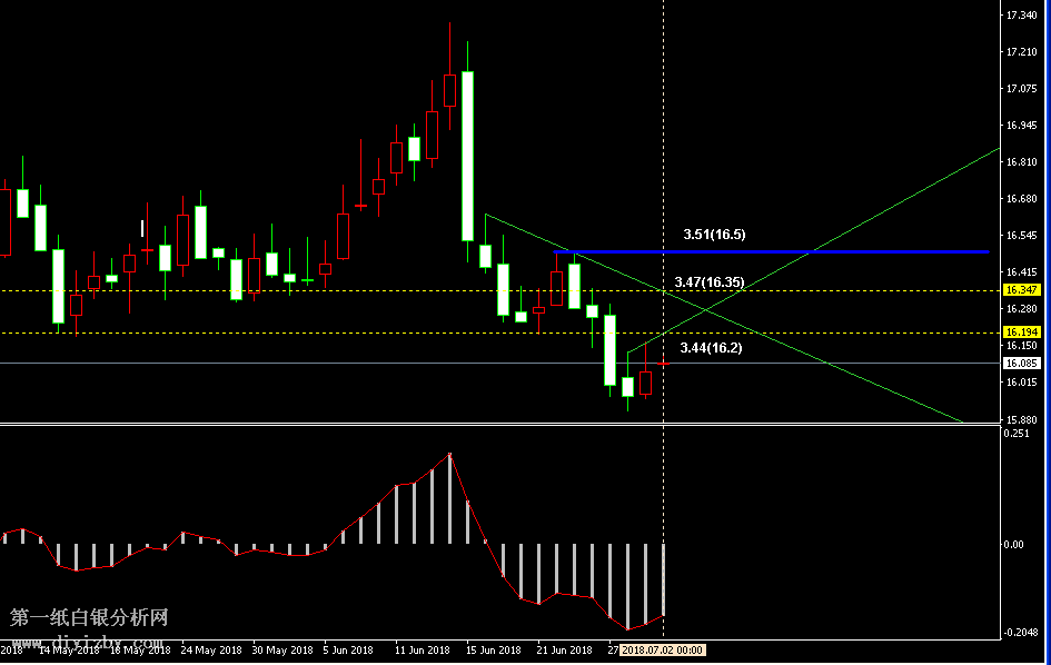 今日下方關(guān)鍵支撐3.36(15.8)、3.24(15.25);今日上方關(guān)鍵阻3.44(16.2)、3.47(16.35)、3.51(16.5)、3.56(16.75)、3.62~3.65(17.05~17.2)、3.69(17.35)。 提示:技術(shù)僅僅是基于概率論和統(tǒng)計(jì)學(xué)的一種綜合分析手段,絕非預(yù)測(cè)。所以技術(shù)分析是在考慮做好止損的情況下去博取大概率事件,投資不可過于迷信技術(shù)分析。(短線操作請(qǐng)一定做好止損,一旦被損,代表分析師基于概率和統(tǒng)計(jì)的技術(shù)分析不適用于當(dāng)前行情) 另外,由于紙白銀價(jià)格是國際銀價(jià)換算而來,而換算過程中涉及到人民幣對(duì)美元匯率的變化,即使在國際銀價(jià)不變化的情況下,如果人民幣貶值或升值,也會(huì)導(dǎo)致紙白銀價(jià)格出現(xiàn)變動(dòng)。因此,我們的分析只采用最新的國際銀價(jià)對(duì)應(yīng)的人民幣白銀價(jià)格,如與過去分析價(jià)格有出入, 投資者應(yīng)知曉其原因。 1、文中價(jià)格為紙白銀價(jià)格,括號(hào)內(nèi)為國際銀價(jià),投資者可雙向參考。 2、以上所有價(jià)格為工商銀行買入價(jià),即紙白銀低價(jià)。進(jìn)倉點(diǎn)位要再加點(diǎn)差(各銀行點(diǎn)差不一),出倉則不要。 3、第一紙白銀給出的所有建議僅供投資者參考,不作為下單絕對(duì)依據(jù),切勿過于依賴。 4、北京時(shí)間09:00發(fā)布此文章。 5、上一交易日白銀價(jià)格分析情況:(6月30日)周評(píng):白銀由震蕩轉(zhuǎn)入下跌 下周跌勢(shì)將延續(xù)