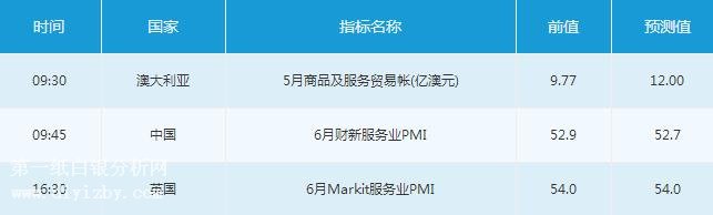 周三(7月4日)投資者需主要關(guān)注09:30公布的澳大利亞5月商品及服務(wù)貿(mào)易帳、09:45公布的中國(guó)6月財(cái)新服務(wù)業(yè)PMI、16:30公布的英國(guó)6月Markit服務(wù)業(yè)PMI。此外,周三為獨(dú)立日,紐約證券交易所,休市一天。