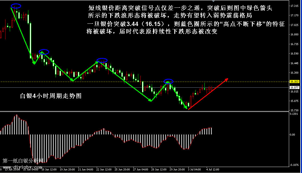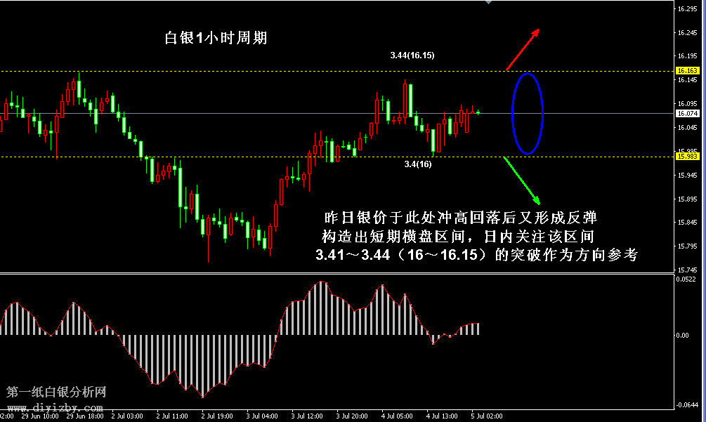 今日下方關(guān)鍵支撐3.36(15.8)、3.24(15.25);今日上方關(guān)鍵阻3.44(16.15)、3.51(16.5)、3.56(16.75)、3.62~3.65(17.05~17.2)、3.69(17.35)。 提示:技術(shù)僅僅是基于概率論和統(tǒng)計(jì)學(xué)的一種綜合分析手段,絕非預(yù)測(cè)。所以技術(shù)分析是在考慮做好止損的情況下去博取大概率事件,投資不可過(guò)于迷信技術(shù)分析。(短線操作請(qǐng)一定做好止損,一旦被損,代表分析師基于概率和統(tǒng)計(jì)的技術(shù)分析不適用于當(dāng)前行情) 另外,由于紙白銀價(jià)格是國(guó)際銀價(jià)換算而來(lái),而換算過(guò)程中涉及到人民幣對(duì)美元匯率的變化,即使在國(guó)際銀價(jià)不變化的情況下,如果人民幣貶值或升值,也會(huì)導(dǎo)致紙白銀價(jià)格出現(xiàn)變動(dòng)。因此,我們的分析只采用最新的國(guó)際銀價(jià)對(duì)應(yīng)的人民幣白銀價(jià)格,如與過(guò)去分析價(jià)格有出入, 投資者應(yīng)知曉其原因。 1、文中價(jià)格為紙白銀價(jià)格,括號(hào)內(nèi)為國(guó)際銀價(jià),投資者可雙向參考。 2、以上所有價(jià)格為工商銀行買(mǎi)入價(jià),即紙白銀低價(jià)。進(jìn)倉(cāng)點(diǎn)位要再加點(diǎn)差(各銀行點(diǎn)差不一),出倉(cāng)則不要。 3、第一紙白銀給出的所有建議僅供投資者參考,不作為下單絕對(duì)依據(jù),切勿過(guò)于依賴(lài)。 4、北京時(shí)間09:00發(fā)布此文章。 5、上一交易日白銀價(jià)格分析情況:(7月4日)白銀反彈沖擊止跌信號(hào)點(diǎn) 突破后將轉(zhuǎn)入震蕩