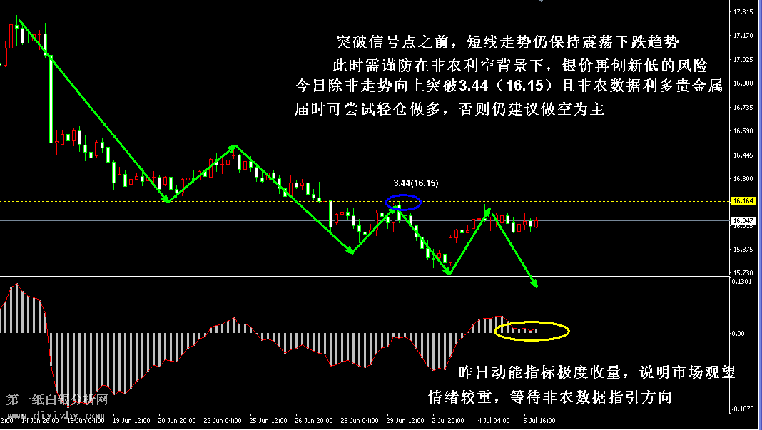 目前白銀價格是3.419克(16.042美元)。昨日銀價維持震蕩整理,在非農數據即將公布之前,投資者正保持謹慎的觀望情緒。由于目前走勢還沒有突破信號點3.44(16.15),短線趨勢依舊處于空頭主導的格局下運行,投資者需謹防非農數據一旦利空,走勢恐再創新低的風險,建議在止跌信號出現之前,勿盲目抄底做多。如下圖所示為白銀4小時周期走勢圖,誠如圖中綠色箭頭所示,當前短線走勢仍然處于下跌趨勢內運行,圖中藍色圈處為短線下跌浪的前浪高點,僅當銀價突破該點位后,原下跌形態才將被破壞,故而可定義3.44(16.15)為當前短線行情的止跌信號點。由于今日即將公布非農數據,而銀價技術面依舊處于偏空的狀態運行,一旦日內非農數據表現為利空貴金屬,則走勢將延續綠色箭頭所示的下跌浪概率極大,根據趨勢波浪形態推測,屆時行情向下再創新低的風險將增大。值得注意的是,圖中動能指標在昨日震蕩中極度收量,這說明市場觀望情緒濃厚,正等待晚間非農數據指引方向。因此今日投資者需結合非農數據和信號點的突破情況進場操作:1.若非農數據利空白銀,此時投資者可直接進場做空,止損信號點3.44(16.15)上方;2.若非農數據利多白銀,保守者仍需等待銀價突破3.44(16.15),確認止跌信號后可進場做多。綜合分析,近期行情在回踩中線第一支撐3.37(15.8)后,雖然并未再度向下破位,但走勢反彈力度仍然薄弱,未能突破信號點,此時尚不可斷言走勢已經止跌企穩。建議投資者持續關注信號點的破位情況,另外日內密切關注非農數據的指引。由于短線趨勢本身處于空頭格局,若數據利空情況下,投資者可嘗試輕倉追空的策略,而數據利多情況下,則需先判斷銀價反彈突破3.44(16.15)的情況,而后才可回落進場做多。今日重點關注晚間20:30公布的非農數據。針對此次技術面與非農數據消息面,第一紙白銀繼續總結4種非農做單策略,僅供投資者參考: