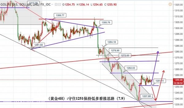 1:1238在技術面上第一是周線級別前期盤中低點1236區域的支撐,第二是短周期以1284為高點的下降通道的支撐線,第三是4小時級別金價跌破旗形震蕩的低點1301和首次觸及的低點1282的下降趨勢支撐線位置,第四是1046-1122的上升趨勢線支撐,由此可見,技術面1238的止跌企穩決非偶然!
