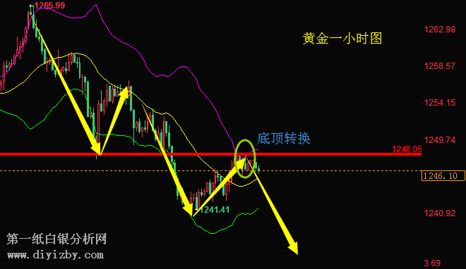 黃金止在1236一線止跌出現了一波反抽的行情,這波反彈承壓日線布林帶中軌阻力出現回落,周三日線收一根大陰線,這根陰線下破了ma5和ma10均線,周四出現小幅反彈,金價任然運行均線下方,均線空頭排列,ma5下穿ma10死叉運行,黃金重回弱勢格局,日線級別布林帶中軌壓制已從1266下移至1258一線,5日均線壓制在1250一線,日內仍需重點1250得失,在行情未站穩布林帶中軌前短線下行風險并未解除。一小時圖中,黃金上行突破布林帶中軌,在上軌遇阻止步于1248.6出現回落,今日操作上建議以高空為主。