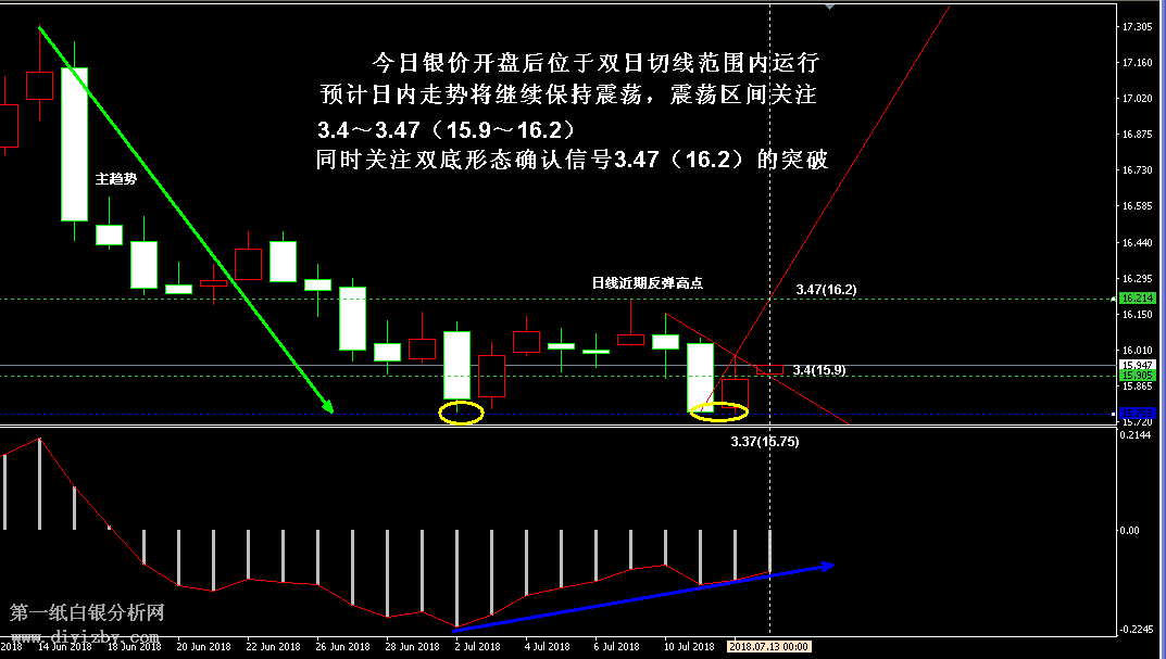 今日下方關鍵支撐3.37(15.75)、3.26(15.25);今日上方關鍵阻3.47(16.2)、3.49~3.51(16.3~16.4)、3.53(16.5)、3.63~3.67(16.95~17.15)、3.71(17.35)。 提示:技術僅僅是基于概率論和統計學的一種綜合分析手段,絕非預測。所以技術分析是在考慮做好止損的情況下去博取大概率事件,投資不可過于迷信技術分析。(短線操作請一定做好止損,一旦被損,代表分析師基于概率和統計的技術分析不適用于當前行情) 另外,由于紙白銀價格是國際銀價換算而來,而換算過程中涉及到人民幣對美元匯率的變化,即使在國際銀價不變化的情況下,如果人民幣貶值或升值,也會導致紙白銀價格出現變動。因此,我們的分析只采用最新的國際銀價對應的人民幣白銀價格,如與過去分析價格有出入, 投資者應知曉其原因。 1、文中價格為紙白銀價格,括號內為國際銀價,投資者可雙向參考。 2、以上所有價格為工商銀行買入價,即紙白銀低價。進倉點位要再加點差(各銀行點差不一),出倉則不要。 3、第一紙白銀給出的所有建議僅供投資者參考,不作為下單絕對依據,切勿過于依賴。 4、北京時間09:00發布此文章。 5、上一交易日白銀價格分析情況:(7月12日)白銀破位還是超跌反彈?多空抉擇將選擇方向