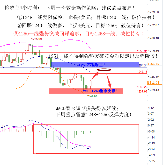 4小時圖中可以看出周五黃金剛好觸及1338一線支撐有效快速起穩,雖然說一波下砸跌破1338最低至1336一線不過1338附近支撐奏效快速反彈最高1244一線震蕩收市;觸及支撐反彈不代表黃金確認底部形成反彈階段,我們亞盤歐盤選擇觀望,黃金反彈形成必須要突破1248-1250一線重點阻力,因此現在1244處于中間地帶操作上當然是比較迷茫,這也就是很多人選擇亞盤還未確認方向而盲目操作導致屢屢被套原因;基本上歐盤或者美盤行情走勢都出來后方向就很明確了;下周亞盤歐盤欲回踩1240一線可選擇低多,若是亞盤歐盤1248-1250一線受阻不前則可選擇高空,強勢突破1250回踩追多;方向都很可觀所以再次建議亞盤不急于布局,等待歐盤美盤到來,重點關注圖中提示重要點位!