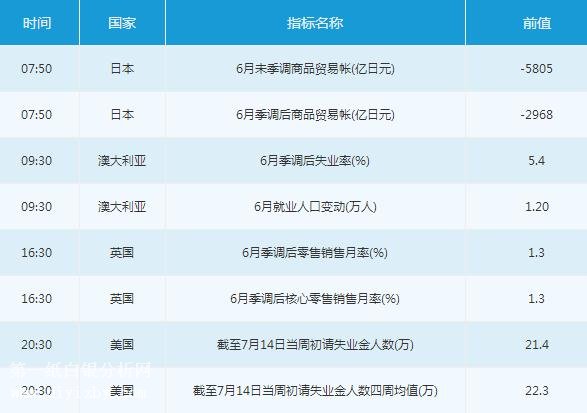 周四(7月19日)亞歐時段,投資者需關(guān)注07:50公布的日本6月未季調(diào)商品貿(mào)易帳、日本6月季調(diào)后商品貿(mào)易帳,09:30公布的澳大利亞6月季調(diào)后失業(yè)率、6月就業(yè)人口變動,16:30公布的英國6月季調(diào)后零售銷售月率、6月季調(diào)后核心零售銷售月率,20:30公布的美國截至7月14日當(dāng)周初請失業(yè)金人數(shù)、美國截至7月14日當(dāng)周初請失業(yè)金人數(shù)四周均值,以及21:00美聯(lián)儲金融監(jiān)管副主席夸爾斯的講話。