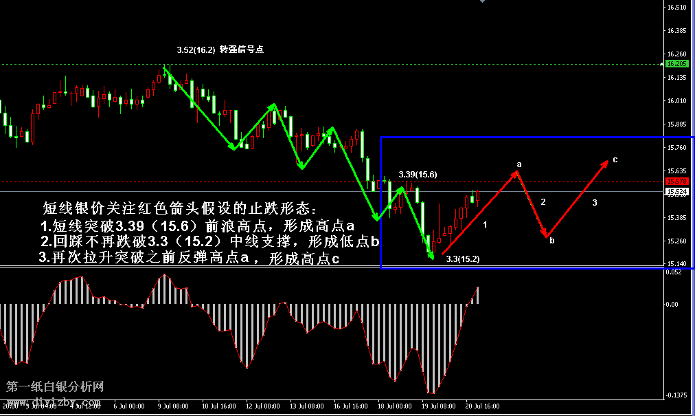 目前白銀價格是3.373元/克(15.519美元/盎司)。上周五銀價在連續下跌后首次反彈,因走勢觸及中線支撐位3.3(15.2)附近,銀價在此處獲得了一定的買盤支撐,投資者本周應繼續關注行情圍繞3.3(15.2)支撐位的反彈力度,若銀價再次下跌仍然守穩3.3(15.2),且反彈浪高點逐漸抬升,則走勢將圍繞支撐3.3(15.2)止跌企穩,屆時行情有望先由下跌趨勢轉入震蕩。如下圖所示為白銀4小時周期走勢圖,圖中綠色箭頭所示為上周白銀從高點3.52(16.2)一路回落形成的下跌趨勢,其中短線下跌起始點位于3.52(16.2)附近,一旦后市行情突破該點位,則走勢必然止跌企穩并轉入強勢震蕩格局,此處可定位行情由弱轉強的信號點,若銀價近期直接反彈突破此處,則不僅僅宣告行情完成止跌,更暗示走勢進入多頭占優的強震蕩格局。除了上述可能發生的止跌信號以外,投資者還可關注圖中藍色框所示的止跌形態的出現,我們以紅色箭頭作為判斷銀價止跌企穩的假設形態,近期行情若反彈疲軟,則必須出現滿足下列要求后,白銀走勢才將完成止跌信號:1.行情近期反彈向上突破圖中紅色虛線所示的前期高點3.39(15.6),并形成新的小高點a,由此將打破原有的綠色箭頭所示的下跌形態;2.再次回落后銀價不再跌破3.3(15.2)的中線支撐位,形成低點b,說明空頭力量較此前已經減弱;3.圍繞低點b銀價形成了二次反彈行情,最終突破前浪高點a,形成高點c,說明多頭力量正不斷增強。當本周行情反彈中滿足上述三大假設條件后,則宣告銀價圍繞3.3(15.2)的止跌企穩形態出現,屆時行情將首先進入“弱勢震蕩”格局,圍繞中線支撐3.3(15.2)和強弱分水嶺3.52(16.2)進行窄幅震蕩。直至突破3.52(16.2)后,走勢將轉入強勢區間。值得注意的是,盡管當前銀價還未出現止跌企穩信號,但走勢觸及中線支撐3.3(15.2)后,下方空間被暫時封閉,此時投資者不可急于追空,應選擇反彈至阻力位附近輕倉高拋做空,激進者圍繞3.3(15.2)不破可輕倉低吸,嚴格止損假設底部下方,當走勢完全出現止跌企穩形態或信號后,投資者可放大倉位操作。綜合分析:近期白銀連續下跌后已經觸及中線支撐位,當前走勢正圍繞支撐位形成反彈,企穩行情仍在醞釀之中。在走勢真正完成止跌之前,投資者仍應以高拋做空思路為主,此時無論是否止跌企穩,走勢仍存在“二次回踩”驗證底部有效性的機會,即空單進場后獲利的可能性極大。特別激進者僅可圍繞3.3(15.2)不破,在該點位上方輕倉試盤做多,直至真正完成止跌形態和信號后,方可正式低吸做多進場。