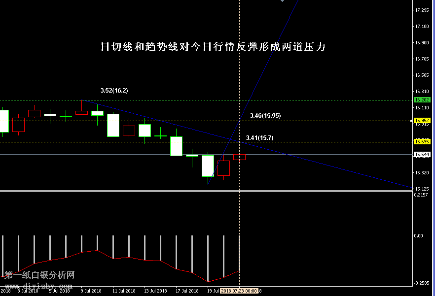 今日下方關鍵支撐3.3(15.2);今日上方關鍵阻3.41(15.7)、3.46~3.47(15.95~16)、3.52(16.2)。 提示:技術僅僅是基于概率論和統計學的一種綜合分析手段,絕非預測。所以技術分析是在考慮做好止損的情況下去博取大概率事件,投資不可過于迷信技術分析。(短線操作請一定做好止損,一旦被損,代表分析師基于概率和統計的技術分析不適用于當前行情) 另外,由于紙白銀價格是國際銀價換算而來,而換算過程中涉及到人民幣對美元匯率的變化,即使在國際銀價不變化的情況下,如果人民幣貶值或升值,也會導致紙白銀價格出現變動。因此,我們的分析只采用最新的國際銀價對應的人民幣白銀價格,如與過去分析價格有出入, 投資者應知曉其原因。 1、文中價格為紙白銀價格,括號內為國際銀價,投資者可雙向參考。 2、以上所有價格為工商銀行買入價,即紙白銀低價。進倉點位要再加點差(各銀行點差不一),出倉則不要。 3、第一紙白銀給出的所有建議僅供投資者參考,不作為下單絕對依據,切勿過于依賴。 4、北京時間09:00發布此文章。 5、上一交易日白銀價格分析情況:(7月20日)白銀大跌觸及中線支撐 止跌前仍以做空為主