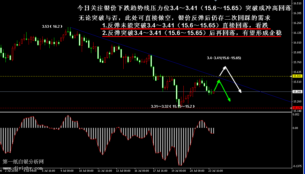 今日下方關(guān)鍵支撐3.31~3.32(15.15~15.2);今日上方關(guān)鍵阻3.4~3.41(15.6~15.65)、3.48~3.49(15.95~16)、3.53(16.2)。 提示:技術(shù)僅僅是基于概率論和統(tǒng)計(jì)學(xué)的一種綜合分析手段,絕非預(yù)測。所以技術(shù)分析是在考慮做好止損的情況下去博取大概率事件,投資不可過于迷信技術(shù)分析。(短線操作請一定做好止損,一旦被損,代表分析師基于概率和統(tǒng)計(jì)的技術(shù)分析不適用于當(dāng)前行情) 另外,由于紙白銀價(jià)格是國際銀價(jià)換算而來,而換算過程中涉及到人民幣對美元匯率的變化,即使在國際銀價(jià)不變化的情況下,如果人民幣貶值或升值,也會導(dǎo)致紙白銀價(jià)格出現(xiàn)變動。因此,我們的分析只采用最新的國際銀價(jià)對應(yīng)的人民幣白銀價(jià)格,如與過去分析價(jià)格有出入, 投資者應(yīng)知曉其原因。 1、文中價(jià)格為紙白銀價(jià)格,括號內(nèi)為國際銀價(jià),投資者可雙向參考。 2、以上所有價(jià)格為工商銀行買入價(jià),即紙白銀低價(jià)。進(jìn)倉點(diǎn)位要再加點(diǎn)差(各銀行點(diǎn)差不一),出倉則不要。 3、第一紙白銀給出的所有建議僅供投資者參考,不作為下單絕對依據(jù),切勿過于依賴。 4、北京時(shí)間09:00發(fā)布此文章。 5、上一交易日白銀價(jià)格分析情況:(7月23日)白銀支撐位強(qiáng)反彈 關(guān)注止跌企穩(wěn)形態(tài)和信號