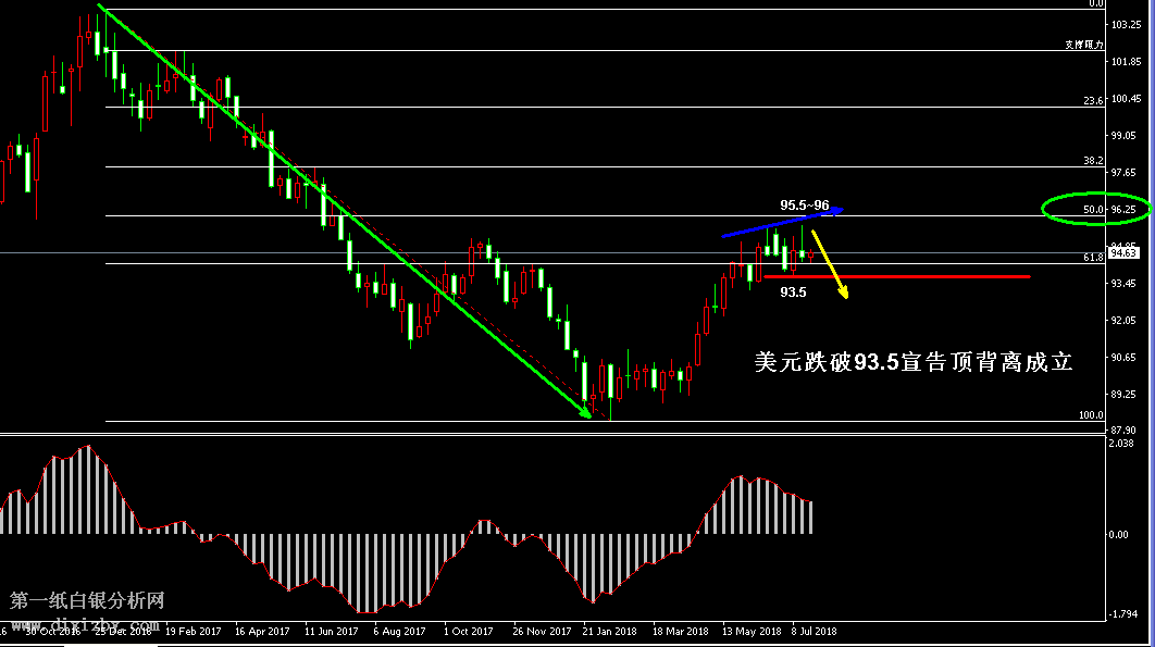 白銀短線策略:(波段:持倉觀望;短線:高拋?zhàn)隹諡橹鳎?span style="margin: 0px; padding: 0px;">。 當(dāng)前白銀的走勢顯然已經(jīng)與美元形成的明顯的反向關(guān)聯(lián),近期美元指數(shù)沖高回落后又出現(xiàn)反彈,但周線形態(tài)中出現(xiàn)“可能見頂”的頂背離形態(tài),投資者應(yīng)密切關(guān)注美元指數(shù)見頂信號,一旦美指反轉(zhuǎn),則有利于白銀價(jià)格圍繞支撐位形成筑底,投資者可密切關(guān)注美元變化。如下圖所示為美元指數(shù)周線走勢圖,2018年美元雖然處于上漲形態(tài),但從中期角度來看,近半年的上漲行情僅僅是中期下跌趨勢的一次反彈。目前美元指數(shù)觸及中期下跌趨勢50%分水嶺的95.5附近后出現(xiàn)了頂背離形態(tài),即價(jià)格創(chuàng)出新高后,動能指標(biāo)未能創(chuàng)出新高,暗示美元買盤力量開始減弱。配合中期阻力位的壓制,投資者需關(guān)注美元指數(shù)是否形成見頂形態(tài),一旦美元向下跌破圖中紅線所示的前低支撐93.5,則上漲趨勢被打破,屆時(shí)配合頂背離形態(tài)成立,美指有望宣告見頂反轉(zhuǎn),這將有利于黃金白銀企穩(wěn)筑底。因此,近期投資者可重點(diǎn)關(guān)注美元對于93.5的跌破情況,若守穩(wěn)此處,則美指仍處于反彈格局;反之,跌破此處時(shí),美指見頂成立,屆時(shí)應(yīng)重點(diǎn)關(guān)注金銀筑底并適當(dāng)開啟做多策略。