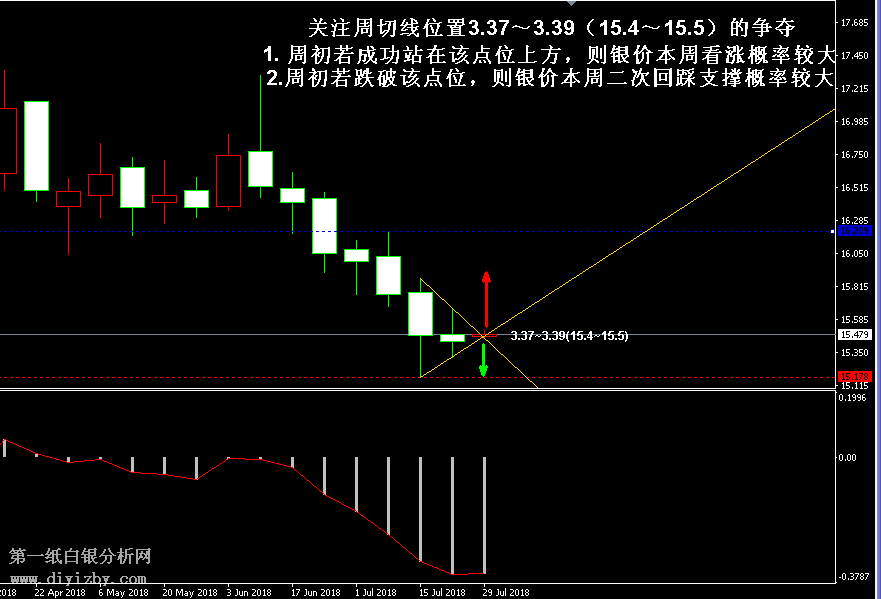 今日下方關鍵支撐3.31~3.32(15.15~15.2);今日上方關鍵阻3.43(15.7)、3.49~3.5(15.95~16)、3.54(16.2)。 提示:技術僅僅是基于概率論和統計學的一種綜合分析手段,絕非預測。所以技術分析是在考慮做好止損的情況下去博取大概率事件,投資不可過于迷信技術分析。(短線操作請一定做好止損,一旦被損,代表分析師基于概率和統計的技術分析不適用于當前行情) 另外,由于紙白銀價格是國際銀價換算而來,而換算過程中涉及到人民幣對美元匯率的變化,即使在國際銀價不變化的情況下,如果人民幣貶值或升值,也會導致紙白銀價格出現變動。因此,我們的分析只采用最新的國際銀價對應的人民幣白銀價格,如與過去分析價格有出入, 投資者應知曉其原因。 1、文中價格為紙白銀價格,括號內為國際銀價,投資者可雙向參考。 2、以上所有價格為工商銀行買入價,即紙白銀低價。進倉點位要再加點差(各銀行點差不一),出倉則不要。 3、第一紙白銀給出的所有建議僅供投資者參考,不作為下單絕對依據,切勿過于依賴。 4、北京時間09:00發布此文章。 5、上一交易日白銀價格分析情況:(7月27日)白銀二次回踩考驗支撐位 繼續關注企穩形態