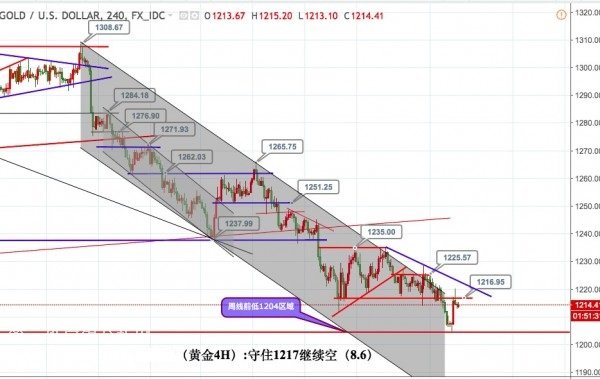 上周市場(chǎng)在震蕩糾結(jié)后下探至周線級(jí)別的前期低點(diǎn)1204后借助非農(nóng)數(shù)據(jù)走了一波反抽,而周五的反抽最終收盤價(jià)依然受制于前期盤中震蕩的低點(diǎn)1217之下,且如圖4小時(shí)錄得一根長上引線的錘子星,由此可見1217的壓制有效性,而大周期日線級(jí)別的下跌格局仍未變,5-10天線仍保持承壓,5周線沒有企穩(wěn)前不考慮多頭格局,同時(shí)短線1225沒有企穩(wěn)談不上多頭反攻!1204的止跌反彈也僅僅是關(guān)鍵點(diǎn)的支撐而已!而超短周期以1235為高點(diǎn)形成的藍(lán)色下降趨勢(shì)線壓制可以看成是空頭防守線!