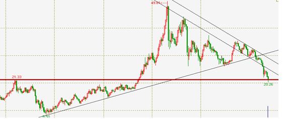 就技術面而言,白銀的弱勢特征顯現無疑,就技術分析的角度來看,目前白銀的運行區間已經開始切入白銀在2008年3月到2010年9月形成的大突破前夕的大震蕩區域,這個區域的價格的密集支撐區間價格帶在18.5——19.5,就目前的白銀市場發展走勢看,無論是從大周期的支撐壓力帶轉換的角度看,還是從白銀今年的下跌節奏和變化幅度看,還是從白銀自2011年4月高點以來的整體下跌結構看,白銀的下步發展動向很可能將走向19一帶,也就是說白銀將有很大機會重新見到十字頭的價格,就短線而言,白銀在20上下的整數關口恐將有心理性的支撐,但是這種支撐力度有限,另外可以關注21上下的技術支撐,如果這兩個位置都難以支撐白銀的話,后面跌破20恐將是大概率事件了。