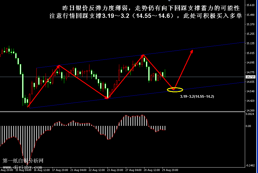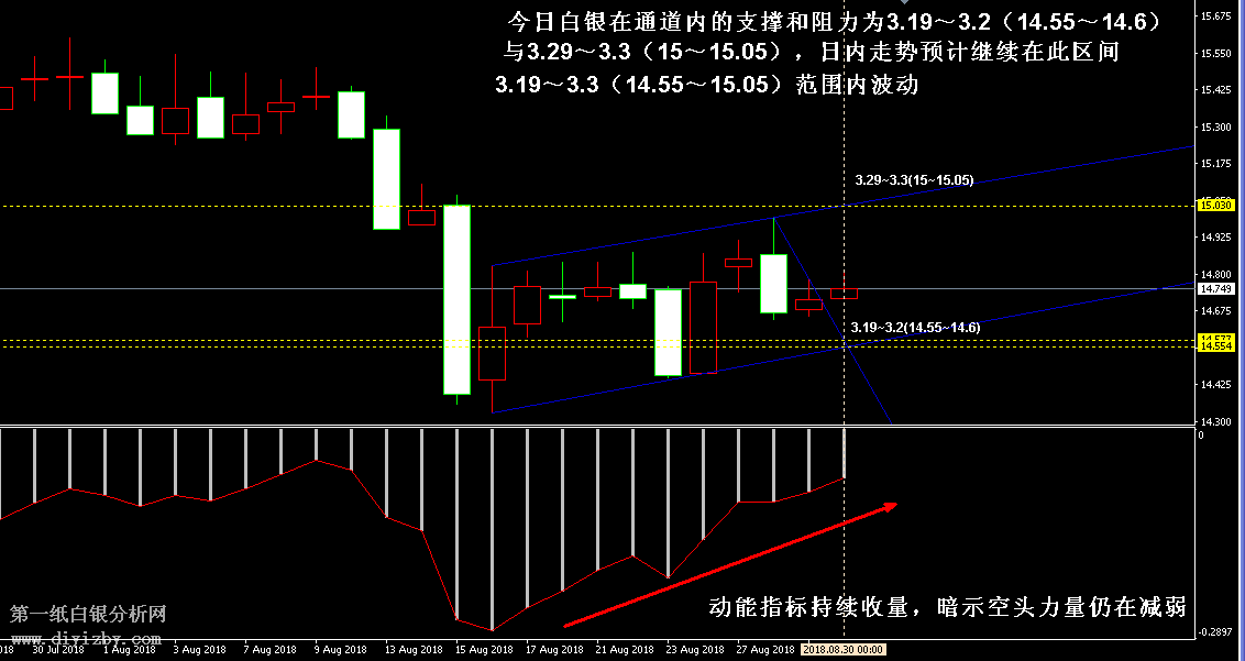 今日下方關鍵支撐3.19~3.2(14.55~14.6)、3.17~3.17(14.4~14.45)、3.13(14.3);今日上方關鍵阻3.29~3.3(15~15.05)、3.36(15.35)、3.4(15.55)、3.43(15.7)。 提示:技術僅僅是基于概率論和統計學的一種綜合分析手段,絕非預測。所以技術分析是在考慮做好止損的情況下去博取大概率事件,投資不可過于迷信技術分析。(短線操作請一定做好止損,一旦被損,代表分析師基于概率和統計的技術分析不適用于當前行情) 另外,由于紙白銀價格是國際銀價換算而來,而換算過程中涉及到人民幣對美元匯率的變化,即使在國際銀價不變化的情況下,如果人民幣貶值或升值,也會導致紙白銀價格出現變動。因此,我們的分析只采用最新的國際銀價對應的人民幣白銀價格,如與過去分析價格有出入, 投資者應知曉其原因。 1、文中價格為紙白銀價格,括號內為國際銀價,投資者可雙向參考。 2、以上所有價格為工商銀行買入價,即紙白銀低價。進倉點位要再加點差(各銀行點差不一),出倉則不要。 3、第一紙白銀給出的所有建議僅供投資者參考,不作為下單絕對依據,切勿過于依賴。 4、北京時間09:00發布此文章。 5、上一交易日白銀價格分析情況:(8月29日)白銀回落未破壞企穩形態 震蕩行情料將延續