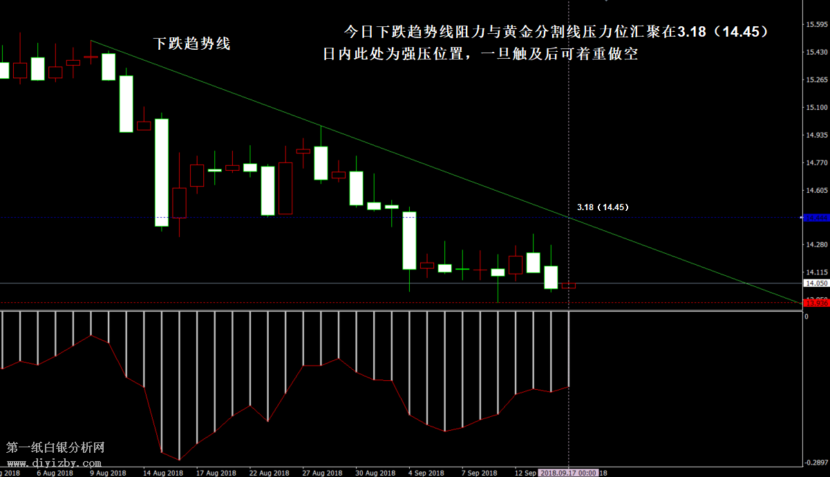 今日下方關鍵支撐3.07~3.08(13.95~14)、2.99(13.6);今日上方關鍵阻力3.18(14.45)、3.22(14.6)、3.25(14.75)、3.28(14.9)、3.3(15)。 提示:技術僅僅是基于概率論和統計學的一種綜合分析手段,絕非預測。所以技術分析是在考慮做好止損的情況下去博取大概率事件,投資不可過于迷信技術分析。(短線操作請一定做好止損,一旦被損,代表分析師基于概率和統計的技術分析不適用于當前行情) 另外,由于紙白銀價格是國際銀價換算而來,而換算過程中涉及到人民幣對美元匯率的變化,即使在國際銀價不變化的情況下,如果人民幣貶值或升值,也會導致紙白銀價格出現變動。因此,我們的分析只采用最新的國際銀價對應的人民幣白銀價格,如與過去分析價格有出入, 投資者應知曉其原因。 1、文中價格為紙白銀價格,括號內為國際銀價,投資者可雙向參考。 2、以上所有價格為工商銀行買入價,即紙白銀低價。進倉點位要再加點差(各銀行點差不一),出倉則不要。 3、第一紙白銀給出的所有建議僅供投資者參考,不作為下單絕對依據,切勿過于依賴。 4、北京時間09:00發布此文章。 5、上一交易日白銀價格分析情況:(9月14日)白銀破強弱點確認底背離 關注走勢反彈力度