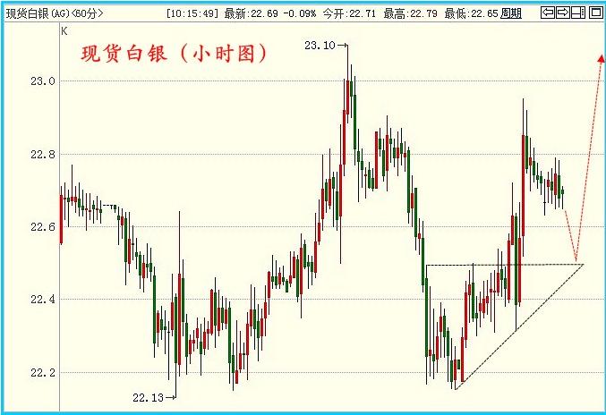 現(xiàn)貨白銀技術研判: 日線圖:單針探底后的橫盤整理,中線觀望。 小時圖:“V”型反轉,短線逢低做多。 【交易指南】 2013-06-04 星期二 國際白銀:22.5附近做多,嚴格止損22.2,目標23.1(破位持有)