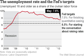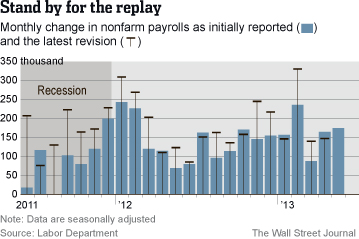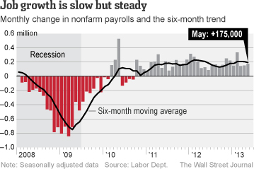 2.數(shù)字修訂:過去許多月就業(yè)報告中的重要數(shù)據(jù),雖然不是從新估算,但也被多次修正。舉個例子,3月非農(nóng)就業(yè)數(shù)據(jù)初步估計是令人擔(dān)憂的8.8萬人,但經(jīng)過修訂后達到14.2萬人。但是修訂數(shù)據(jù)也不是重要的,因為這只是提供一個前幾個月更正準確的宏觀圖片。雖然這些數(shù)據(jù)也為未來幾個月的預(yù)測提供關(guān)鍵線索,但在加快聘用期間,勞工部的初步估計數(shù)字往往是低估就業(yè)增長,這意味著可以使得未來幾個月顯現(xiàn)出好的增長。所以要小心向下修訂的數(shù)字。 3.美聯(lián)儲所關(guān)心的問題:上個月伯南克在國會的證詞掀起了債券拋售的熱潮,這促使央行官員紛紛發(fā)表言論解釋美聯(lián)儲的意思,安撫市場。在紛亂過后,我們要注意的是美聯(lián)儲的就業(yè)預(yù)期是建立在相對樂觀的經(jīng)濟增長預(yù)期基礎(chǔ)上的。按照亞特蘭大聯(lián)儲的簡單計算,如果每個月增加16.7萬個就業(yè)崗位,則在明年6月實現(xiàn)失業(yè)人數(shù)下降至7%的目標。因此,任何過快或過慢的增長都會引起美聯(lián)儲和市場的關(guān)注。