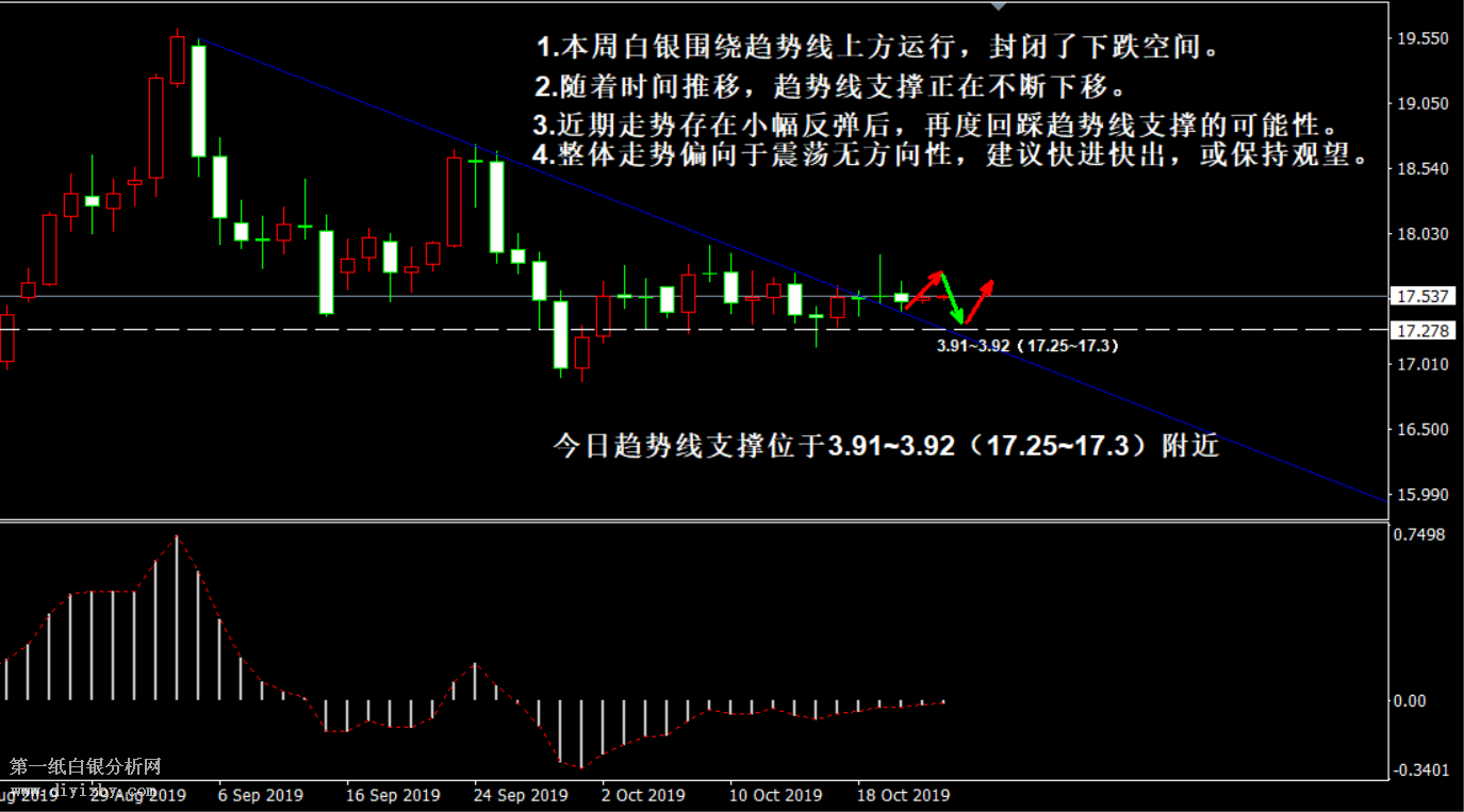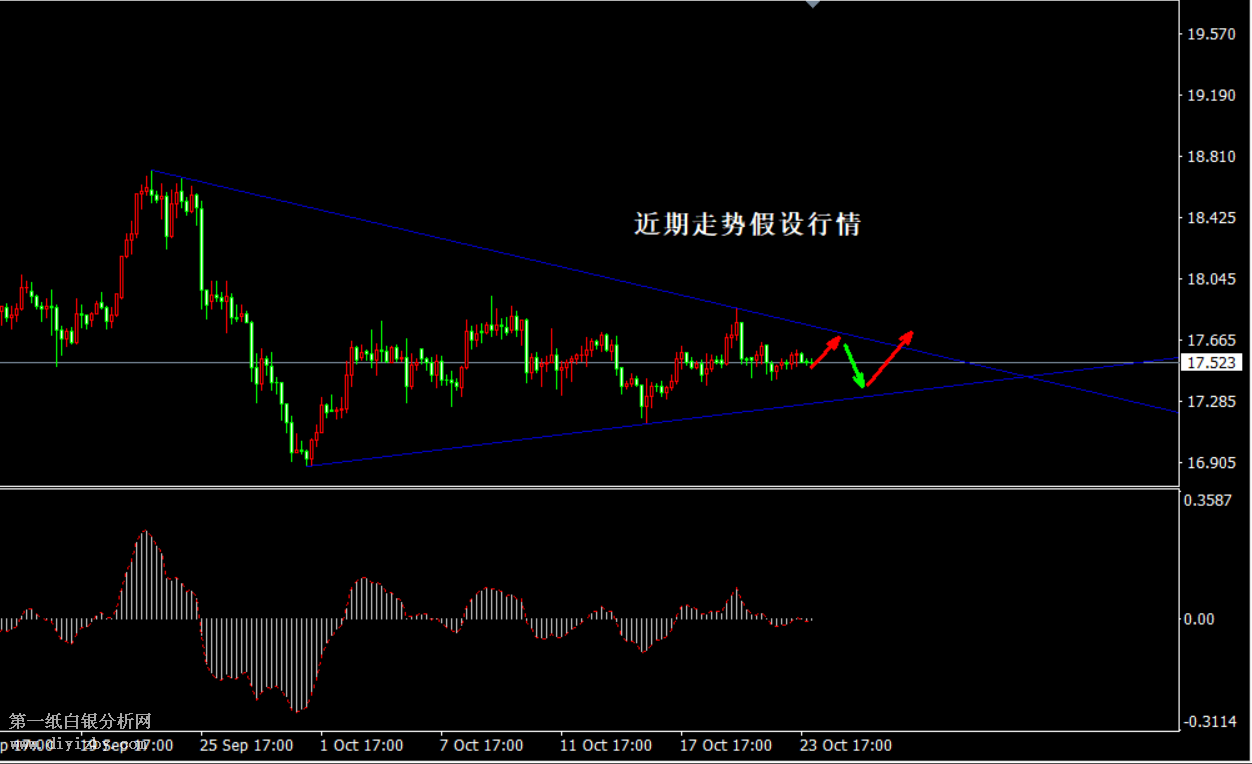 今日下方關(guān)鍵支撐3.88(17.1)、3.82(16.85)、3.75~3.77(16.6~16.65)、3.71~3.72(16.45~16.5);今日上方關(guān)鍵阻力4.08(18)、4.12(18.2)。 提示:技術(shù)僅僅是基于概率論和統(tǒng)計學的一種綜合分析手段,絕非預測。所以技術(shù)分析是在考慮做好止損的情況下去博取大概率事件,投資不可過于迷信技術(shù)分析。(短線操作請一定做好止損,一旦被損,代表分析師基于概率和統(tǒng)計的技術(shù)分析不適用于當前行情) 另外,由于紙白銀價格是國際銀價換算而來,而換算過程中涉及到人民幣對美元匯率的變化,即使在國際銀價不變化的情況下,如果人民幣貶值或升值,也會導致紙白銀價格出現(xiàn)變動。因此,我們的分析只采用最新的國際銀價對應的人民幣白銀價格,如與過去分析價格有出入, 投資者應知曉其原因。 1、文中價格為紙白銀價格,括號內(nèi)為國際銀價,投資者可雙向參考。 2、以上價格為工商銀行買入價,即紙白銀低價。進倉點位要再加點差(各銀行點差不一),出倉則不要。 3、第一紙白銀給出的所有建議僅供投資者參考,不作為下單依據(jù),作者不持有白銀,也不計劃買入。觀點僅供參考,不構(gòu)成投資建議,風險自擔。 4、北京時間09:00發(fā)布此文章。 5、上一交易日白銀價格分析情況:(10月23日)白銀震蕩仍守穩(wěn)趨勢線 支撐位可繼續(xù)關(guān)注反彈