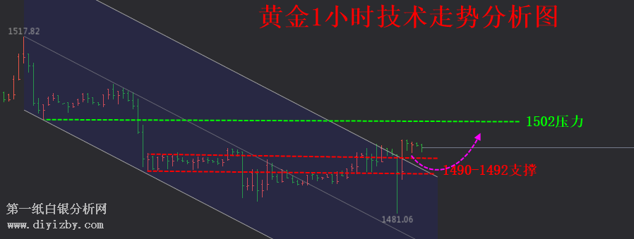 4:小周期之中,1小時慢牛橫盤向上,支撐位置1490一線,MACD快慢線還處于鈍化向上;