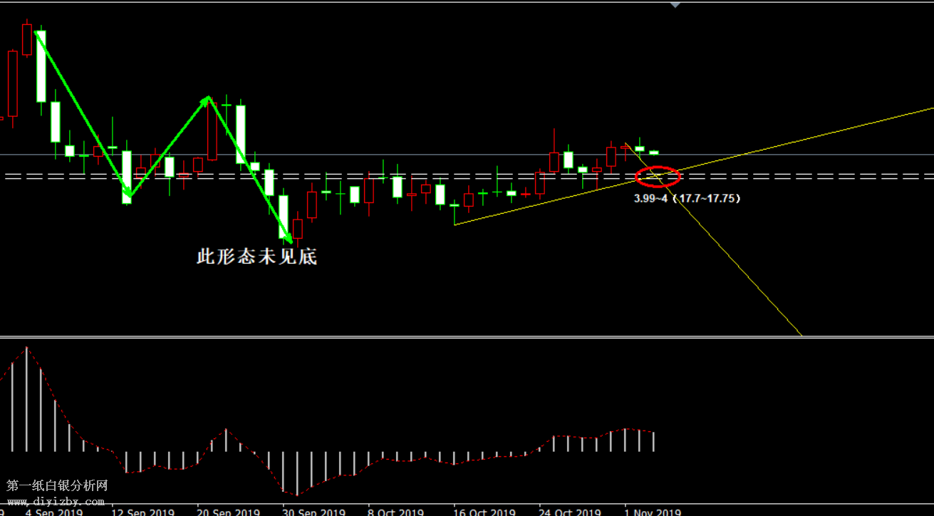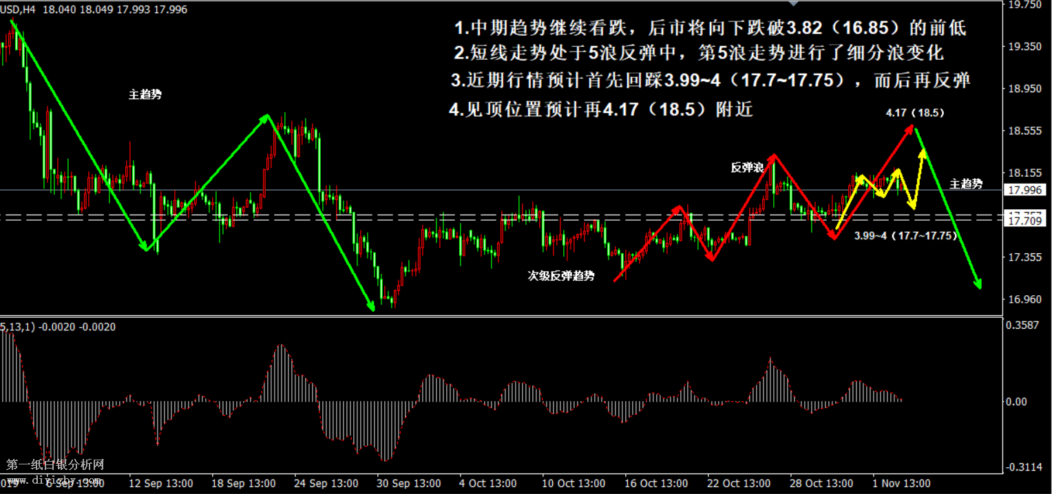 今日下方關鍵支撐3.99~4(17.7~7.75)、3.96(17.6);今日上方關鍵阻力4.17(18.5)。 提示:技術僅僅是基于概率論和統計學的一種綜合分析手段,絕非預測。所以技術分析是在考慮做好止損的情況下去博取大概率事件,投資不可過于迷信技術分析。(短線操作請一定做好止損,一旦被損,代表分析師基于概率和統計的技術分析不適用于當前行情) 另外,由于紙白銀價格是國際銀價換算而來,而換算過程中涉及到人民幣對美元匯率的變化,即使在國際銀價不變化的情況下,如果人民幣貶值或升值,也會導致紙白銀價格出現變動。因此,我們的分析只采用最新的國際銀價對應的人民幣白銀價格,如與過去分析價格有出入, 投資者應知曉其原因。 1、文中價格為紙白銀價格,括號內為國際銀價,投資者可雙向參考。 2、以上價格為工商銀行買入價,即紙白銀低價。進倉點位要再加點差(各銀行點差不一),出倉則不要。 3、第一紙白銀給出的所有建議僅供投資者參考,不作為下單依據,作者不持有白銀,也不計劃買入。觀點僅供參考,不構成投資建議,風險自擔。 4、北京時間09:00發布此文章。 5、上一交易日白銀價格分析情況:(11月4日)白銀短線反彈行情或延續 中期看跌趨勢仍不變