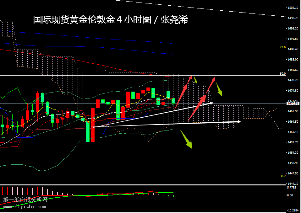 4小時級別,金價依托30周期線為支撐震蕩反彈上行,并運行在云帶之中,后市仍有向上發(fā)展突破云層到至1480美元目標位的趨勢,指標上,MACD綠色動能柱顯現(xiàn),KDJ隨機指標轉(zhuǎn)而向下,暗示金價有進一步下撤的趨勢,下方關注1467-1465美元支撐可保持看漲。上方仍關注隔夜高點及1480美元為目標位。