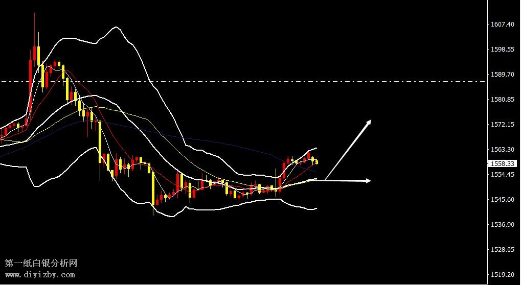 黃金半小時圖走勢分析,黃金在上周三早盤沖高1611美金新高承壓震蕩回落,至周三收盤最低回落觸及1552美金,整體回調接近60美金,周四黃金亞盤承壓1561美金延續向下回落,最低回落觸及1540美金企穩震蕩。周五黃金午后回踩1546美金企穩震蕩,晚間突破1557美金壓力,最高反彈觸及1563美金,帶動半小時圖布林帶向上發散運行。黃金今日亞歐盤時段下方支撐關注1552美金,上方壓力關注1563美金高點位置,若今日亞盤突破1563美金將進一步打開反彈空間,上方進一步看漲1570,1578美金。