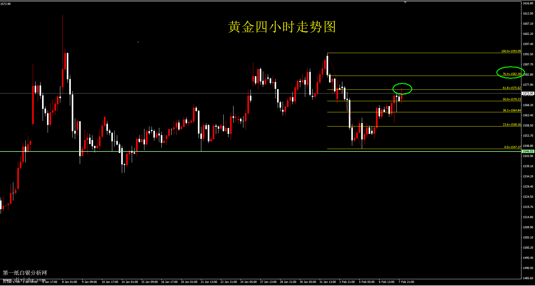 今天早上黃金開盤繼續拉升直接觸及到1593-1547回調位的61.8%即1575價位,這個位置如果受阻,空頭有機會進行反撲讓金價短期重新進入跌勢。從整體的結構上去看將有可能奠定1611高點和1593次級高點進行下跌結構的演變,所以在1575或1583價位如果出現下跌的技術信號(比如一小時或四小時K線的陰陽轉化)便可以考慮介入空單的操作機會,讓后以日內高點作為防守,日內下方關注1560價位的支撐,而后市如果跌破1546則進一步下看1540-1535局域。
