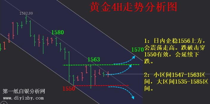 3:在短線上,1575一線是黃金下跌趨勢線的壓力位置,如下圖所示,是按照趨勢通道的趨勢線壓力進行劃分!
