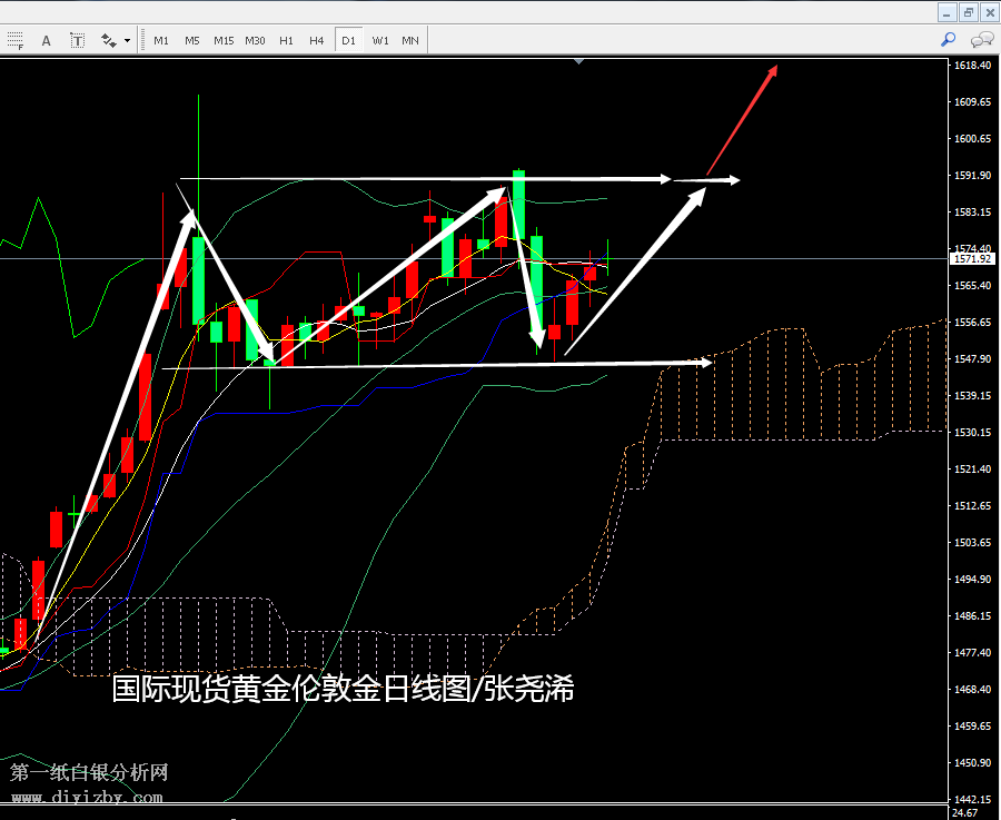 周線級別;金價探底回升,雖收取陰柱,但形態(tài)上,對于后市有延續(xù)性的作用和信號,下方10周期線支撐1531美元附近也未觸及測試,說明空頭回撤力度并不是沖著轉下行趨勢來的,仍將是回撤買入的看漲行情。下方關注1558-1560美元支撐,重點仍在1550美元關口,上方關注1580美元及1593美元阻力。