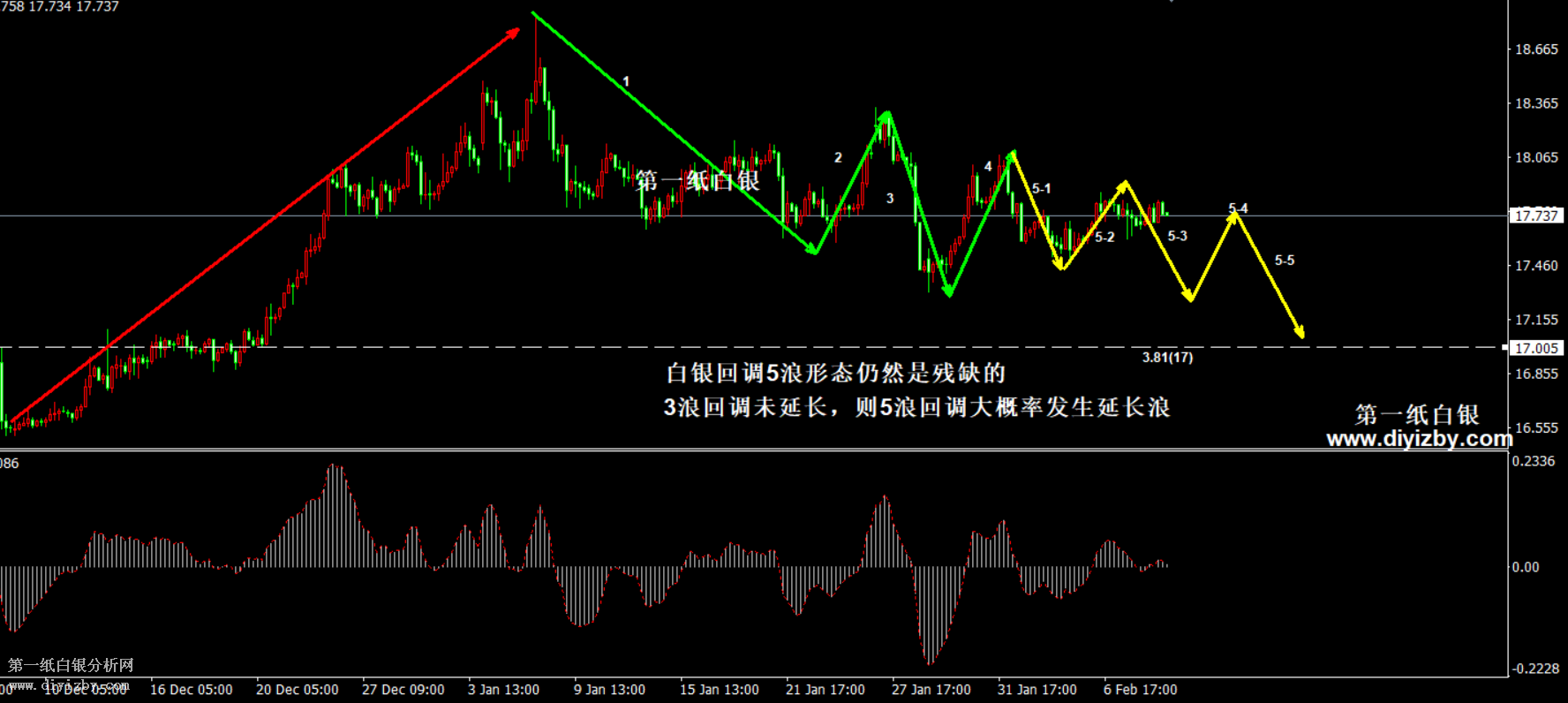目前白銀價(jià)格是3.982元/克(17.741元/盎司)。近期行情交投清淡,連續(xù)幾日維持窄幅震蕩,但從形態(tài)上分析,由于白銀并未向上突破多空分水嶺4.07(18.15),同時(shí)波浪顯示行情仍具備再度回踩支撐的預(yù)期,因此推測走勢此時(shí)并未回調(diào)完畢,投資者可仍然保留部分倉位,等待走勢向下回踩強(qiáng)支撐后分批加倉多單。如下圖所示為白銀4小時(shí)周期走勢圖,圖中黃綠箭頭的交替為當(dāng)前白銀運(yùn)行的一輪回調(diào)走勢,此輪回調(diào)被稱之為大趨勢的第2浪回調(diào)。其內(nèi)部結(jié)構(gòu)可劃分為5個(gè)小浪,截至目前為止,圖中綠色箭頭所示的1浪~4浪形態(tài)已經(jīng)運(yùn)行完畢,白銀進(jìn)入最后的第5小浪運(yùn)行之中。然而由于綠色箭頭所示的3浪未能發(fā)生延長,根據(jù)波浪運(yùn)行規(guī)律推測,5浪發(fā)生延長的概率將較大,即第5小浪下跌大概率以圖中黃色箭頭所示的細(xì)分浪的方式運(yùn)行。注意觀察近期走勢向下發(fā)生5·3浪的回落,而后反彈后仍有5-5浪的最后一跌。根據(jù)幅度推測,最終走勢仍有向下回踩強(qiáng)支撐3.81(17)附近的可能性,故而建議投資者繼續(xù)保留部分倉位,等待銀價(jià)回踩至上述點(diǎn)位后布局多單。除此之外,由于主趨勢維持圖中紅色箭頭所示的看漲形態(tài),因此投資者需隨時(shí)謹(jǐn)防行情的第5浪下跌發(fā)生夭折的可能性。為了防止踏空,一方面建議采取分批布局的方式補(bǔ)倉多單,另一方面可關(guān)注近期多空分水嶺4.07(18.15),此處為4浪反彈高點(diǎn),一旦銀價(jià)向上突破該點(diǎn)位后,則屆時(shí)第5浪下跌將提前結(jié)束,白銀有望向上展開新一輪拉升,以順應(yīng)圖中紅色箭頭所示的主趨勢上漲。因此,一方面投資者繼續(xù)等待低位支撐加倉多單,若銀價(jià)不能回落至低位支撐,向上突破4.07(18.15)后方可抬升做多點(diǎn)位。綜合分析:在白銀未能突破多空分水嶺4.07(18.15)之前,投資者應(yīng)盡量等待銀價(jià)回踩至低位支撐分批布局多單,后市可重點(diǎn)關(guān)注3.81(17)附近的回踩風(fēng)險(xiǎn);一旦突破4.07(18.15)后,代表走勢止跌企穩(wěn),銀價(jià)將向上開啟新一輪上漲,屆時(shí)待銀價(jià)回調(diào)后可抬升做多點(diǎn)位。