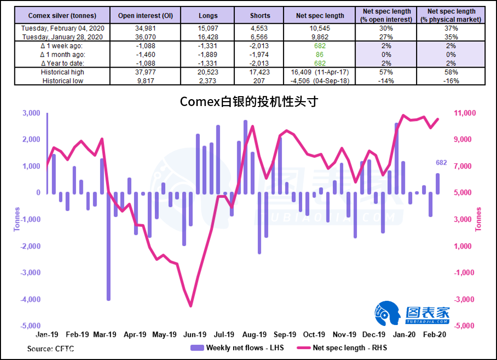 在截至2月4日的一周內,投機者對Comex白銀的凈多頭頭寸大幅增加,達到682噸。同期白銀現貨價格小幅上漲0.4%。