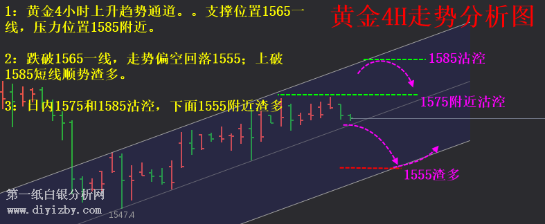 短線上1560支撐有效,其次是1565一線支撐位置。短線上可以按照1565-1585的這個區間處理。短線上的多,只作為日內考慮的。主要的思路是震蕩反彈修正中逢高沽空看跌回落。其中1582附近布局空單,看日K的頂背離下跌修正。