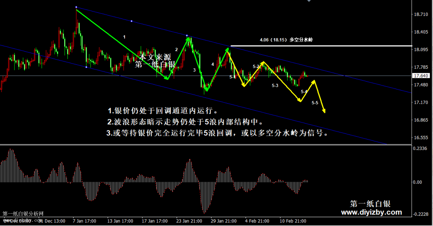 目前白銀價格是3.954元/克(17.642元/盎司)。昨日銀價小幅反彈,在此前行情連續下跌后,走勢出現短暫的修復,但截至目前位置,行情仍處于回調形態內波動。一方面投資者可繼續關注強支撐3.81(17)附近,另一方面仍然以多空分水嶺4.06(18.15)為參考信號,若銀價未能繼續回落,則需等待行情突破此處后,方可確認為反轉。如下圖所示為白銀4小時周期走勢圖,近期的走勢形態推演維持一致,由于當前銀價波動緩慢,價格始終處于圖中黃色箭頭所示的5浪內部運行,故而投資者可忽略中途的小幅波動,以最終的向上突破或向下回踩為重點關注。當前白銀的整體結構仍然以5浪回調形態為主,過去走勢已經運行了圖中綠色箭頭所示的1~4浪調整,當前走勢正處于圖中黃色箭頭所示的5浪中波動,由于5浪已經發生了延長,因此大概率將走出圖中箭頭所示的細分浪模式。最終投資者可關注強支撐3.81(17)附近或通道下沿的回踩情況。除此之外,為了防止5浪在回調中突然發生夭折的風險,投資者可參考圖中白線所示高點4.06(18.15)為多空分水嶺,該點位是前浪(4浪)高點,故而行情一旦向上突破此處,則暗示5浪調整提前結束,屆時走勢不僅突破回調通道,還向上突破多空分水嶺,暗示走勢將展開新一輪上漲。因此我們得出的結論是,銀價在突破4.06(18.15)分水嶺之前,投資者應盡量等待行情回踩強支撐3.81(17)附近和通道下沿,屆時判斷5浪形態完全運行完畢后可大幅增加倉位做多。一般投資者可采取分批于支撐位布局多單的方法。值得注意的是,盡管目前白銀走勢調整節奏緩慢,但主趨勢仍然處于上漲格局,目前行情形態上還差最后一輪連續回落,因此建議一般投資者可采取順勢分批布局多單的方法操作。綜合分析:僅從近期走勢窄幅波動的形態推測,白銀價格并未有充足的信號暗示已經調整完畢,因此,投資者可以多空分水嶺4.06(18.15)為參考信號;在突破信號之前,應盡量等待行情再次回踩強支撐3.81(17)或通道下沿后重點加倉多單。