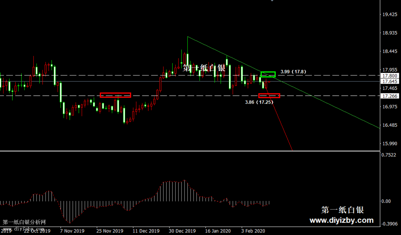 今日下方關鍵支3.86(17.25)、3.8(17)。今日上方關鍵阻力3.99(17.8)、4.06(18.15)、4.12(18.35)。 提示:技術僅僅是基于概率論和統計學的一種綜合分析手段,絕非預測。所以技術分析是在考慮做好止損的情況下去博取大概率事件,投資不可過于迷信技術分析。(短線操作請一定做好止損,一旦被損,代表分析師基于概率和統計的技術分析不適用于當前行情) 另外,由于紙白銀價格是國際銀價換算而來,而換算過程中涉及到人民幣對美元匯率的變化,即使在國際銀價不變化的情況下,如果人民幣貶值或升值,也會導致紙白銀價格出現變動。因此,我們的分析只采用最新的國際銀價對應的人民幣白銀價格,如與過去分析價格有出入, 投資者應知曉其原因。 1、文中價格為紙白銀價格,括號內為國際銀價,投資者可雙向參考。 2、以上價格為工商銀行買入價,即紙白銀低價。進倉點位要再加點差(各銀行點差不一),出倉則不要。 3、第一紙白銀給出的所有建議僅供投資者參考,不作為下單依據,作者不持有白銀,也不計劃買入。觀點僅供參考,不構成投資建議,風險自擔。 4、北京時間09:00發布此文章。 5、上一交易日白銀價格分析情況:(2月13日)白銀回調行情仍未結束 后市關注回踩通道支撐