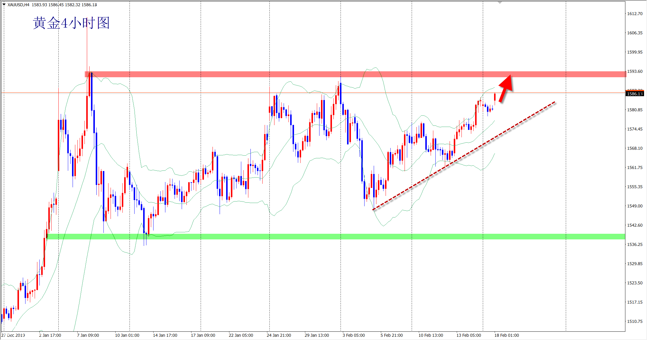 也要提醒大家一點的是,上方面臨1590位置的壓力,暫時不要輕易追多,回落后再次進場干多!如果行情能強勢突破1590壓力,再順勢跟進即可!