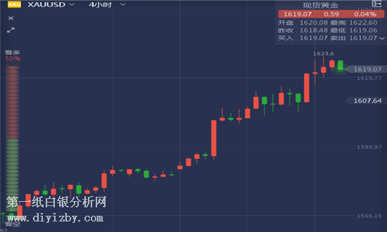 技術(shù)面,金價(jià)慢漲上行,從4小時(shí)圖來(lái)看,金價(jià)維持上行之勢(shì),破位1620關(guān)口,日線級(jí)別來(lái)看,黃金突破一個(gè)多月的高位震蕩行情繼續(xù)向上發(fā)力,布林帶向上開(kāi)口,各均線多頭排列,附圖指標(biāo)MACD零軸上方金叉,紅色動(dòng)能柱持續(xù)放量,預(yù)示黃金處于強(qiáng)勢(shì)多頭走勢(shì)中,不過(guò)sto指標(biāo)目前嚴(yán)重超買(mǎi),指標(biāo)顯示有修正的需求,操作上高位不易追多,目前價(jià)格強(qiáng)勢(shì)上漲,日內(nèi)早盤(pán)高點(diǎn)1612.8已轉(zhuǎn)換支撐。