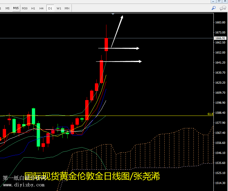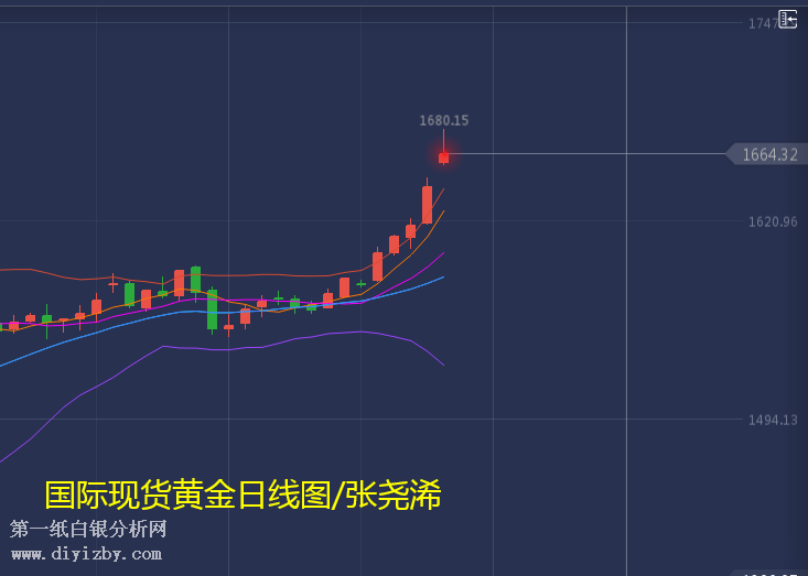 日線級(jí)別,金價(jià)連續(xù)大陽(yáng)攀升,早盤(pán)一度跳漲刷新上周高點(diǎn)至1680美元再創(chuàng)7年新高,周末給出的還有新高的目標(biāo)位也瞬間突破。觀點(diǎn)上,上周張堯浠說(shuō)道,黃金自1160美元而上,目前已經(jīng)走到目前的第三波漲勢(shì),而目標(biāo)可放大至1665(已到達(dá)),最高乃至到1700美元,之后跟的就是個(gè)大回撤,然后回撤至1491一線或者1500再漲。之后則看至2012年高點(diǎn)1796.41附近。不過(guò)跟進(jìn)上述基本面觀點(diǎn),最高可再看至1700-1750美元看大回撤。