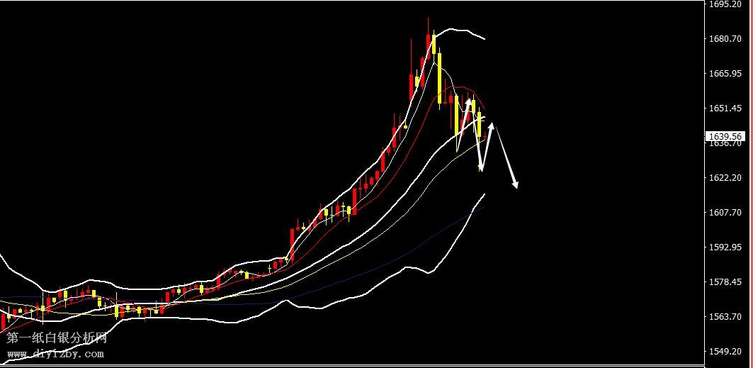 黃金隔日整體延續向下回調修正,隔夜美盤黃金反彈1658美金再次承壓大幅回落,最低下跌觸及1625美金,日線報收一根高位實體中陰K線。