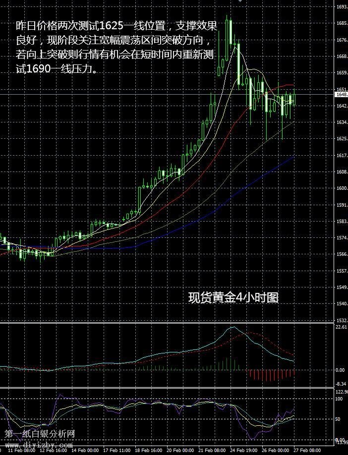 從現貨黃金4小時圖看,昨日價格兩次測試1625一線位置,支撐效果良好,現階段關注寬幅震蕩區間突破方向,若向上突破則行情有機會在短時間內重新測試1690一線壓力。