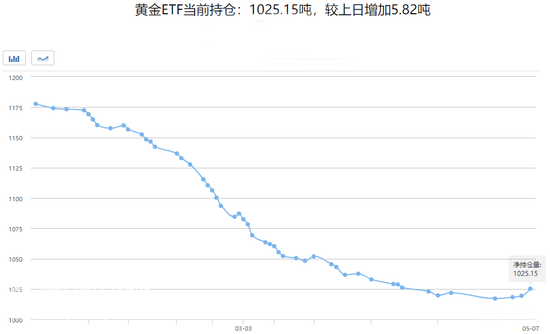 5月8日黃金ETFs數據顯示,截止5月7日全球最大的黃金ETF-SPDR Gold Trust的黃金持倉量1025.15噸,較上一交易日增加5.82噸,增持數量為1月15日以來最多。