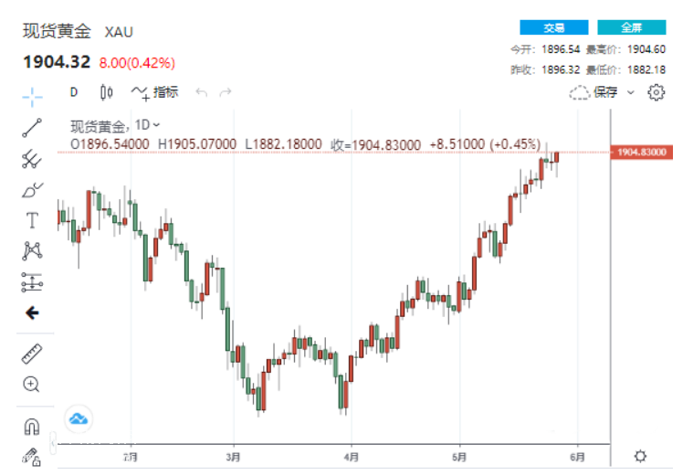 預算報告公布后,現貨黃金延續漲勢并刷新日高至1905.90美元。