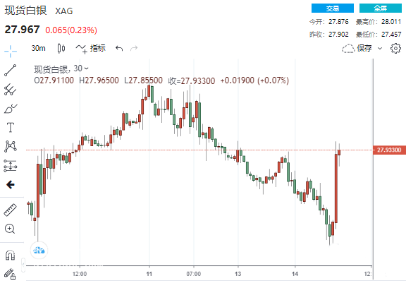現貨白銀(28.01, -0.13, -0.48%)一度觸及27.457美元/盎司低點,但隨后自低位大幅上漲至27.967美元/盎司,日內由跌轉漲。