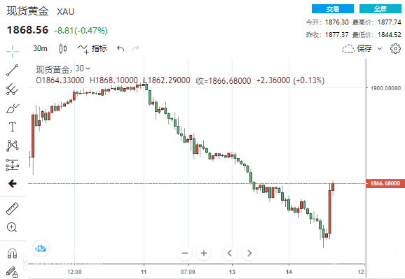 現貨金下跌約1.5%,至5月17日以來的最低水平1844.52美元/盎司,但很快從低位反彈至近24美元/盎司,至1868.56美元/盎司。