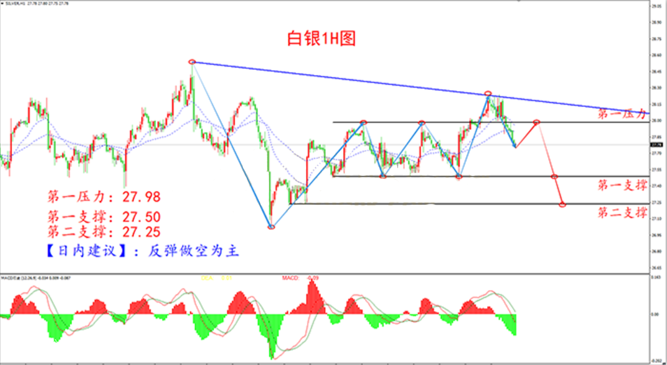 從上圖白銀1H周期走勢來看,白銀自28.53周邊下跌,在跌至27.02周邊受到支撐,隨后反彈至27.93周邊受阻,圍繞27.50至27.98振動整頓。上周四在沖破區間上軌壓力后周五再次回到區間之內,走出多頭衰竭狀態,證實反彈行情或已結束,后市較大概率不斷下跌,操作上可關注空單機會。結合MACD指標來看,DIFF線與DEA死叉向下,但綠色能量柱在縮小,證實空頭力量在減弱,短線或有反彈,日內操作可在其反彈至27.98周邊嘗試空單。