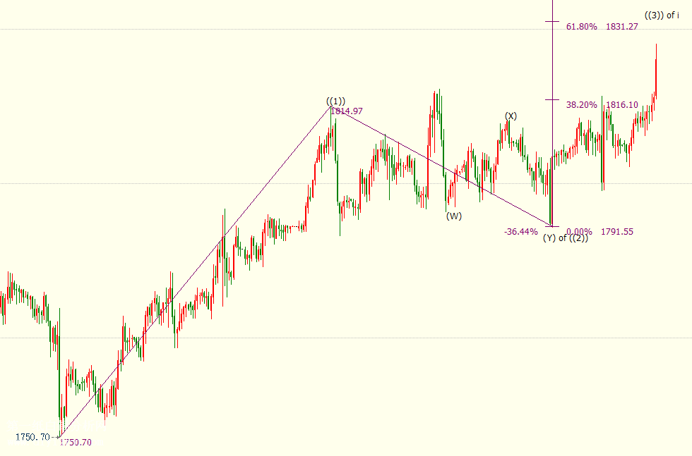 小時圖上來觀察,金價自1792美元開啟上行((3))浪走勢,料升破61.8%目標位1831美元,并且進一步挑戰76.4%目標位1841美元。((3))浪是從1751美元開啟的上行i浪的子浪。