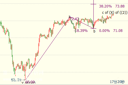 日線圖上,NYMEX原油從76.98美元開始處于調整((2))波。在小時圖上,油價可能從71.08美元開始向上的C波趨勢,阻力看38.2%的目標在73.88美元。c波是(x)波的子波,從65.09美元開始,而(x)波是(2)波的子波。